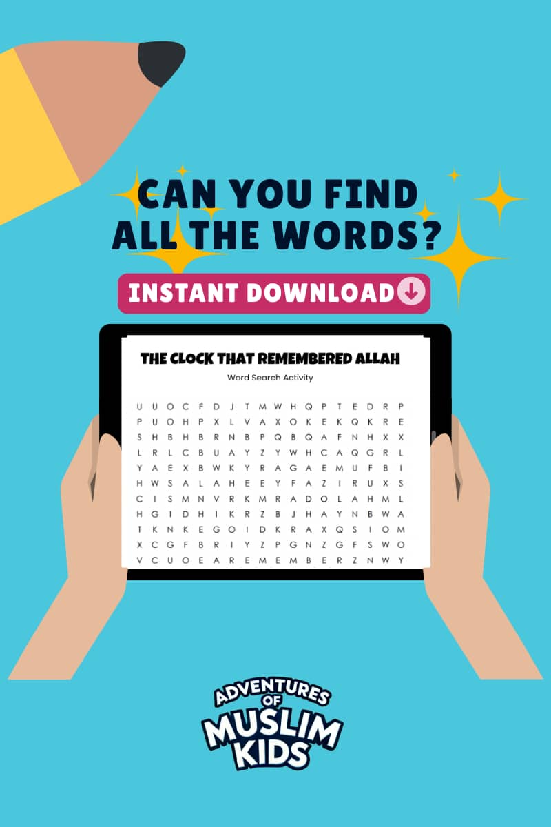 This word search brings the episode “The Clock That Remembered Allah” to life with a quick, screen-free activity kids can enjoy anywhere.